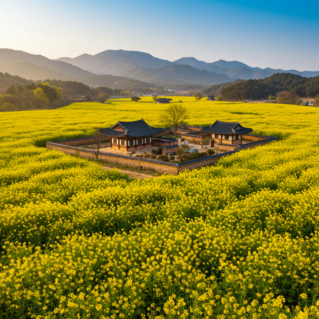 경상북도의 봄은 유채꽃의 노란 물결로 더욱 빛납니다.