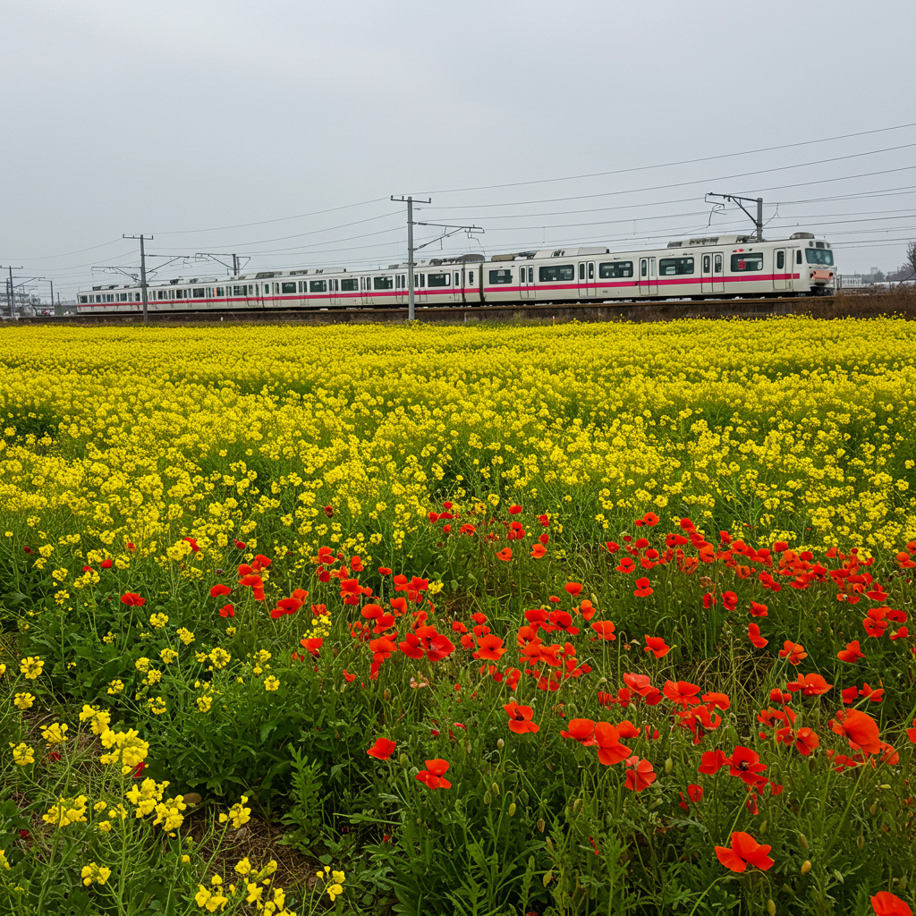 하동 북천 꽃단지는 가을 코스모스와 메밀꽃 축제로 유명하지만, 봄에는 그 자리를 노란 유채꽃과 함께 다채로운 봄꽃들이 채웁니다. 넓은 평지에 유채꽃뿐만 아니라 붉은 꽃양귀비 등 다양한 색상의 봄꽃들이 함께 피어나 화려하고 생동감 넘치는 풍경을 선사합니다.