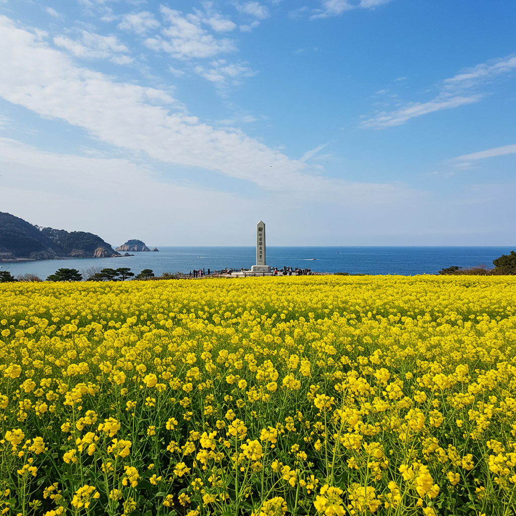 한반도의 시작점이자 끝점인 해남 땅끝마을에서도 아름다운 유채꽃을 만날 수 있습니다. 땅끝마을 전망대 주변과 송호해수욕장 인근에 조성된 유채꽃밭은 탁 트인 남해 바다와 어우러져 희망찬 봄의 기운을 물씬 풍깁니다. 땅끝이라는 상징적인 장소에서 만나는 노란 유채꽃물결은 더욱 특별한 감동을 선사합니다.
