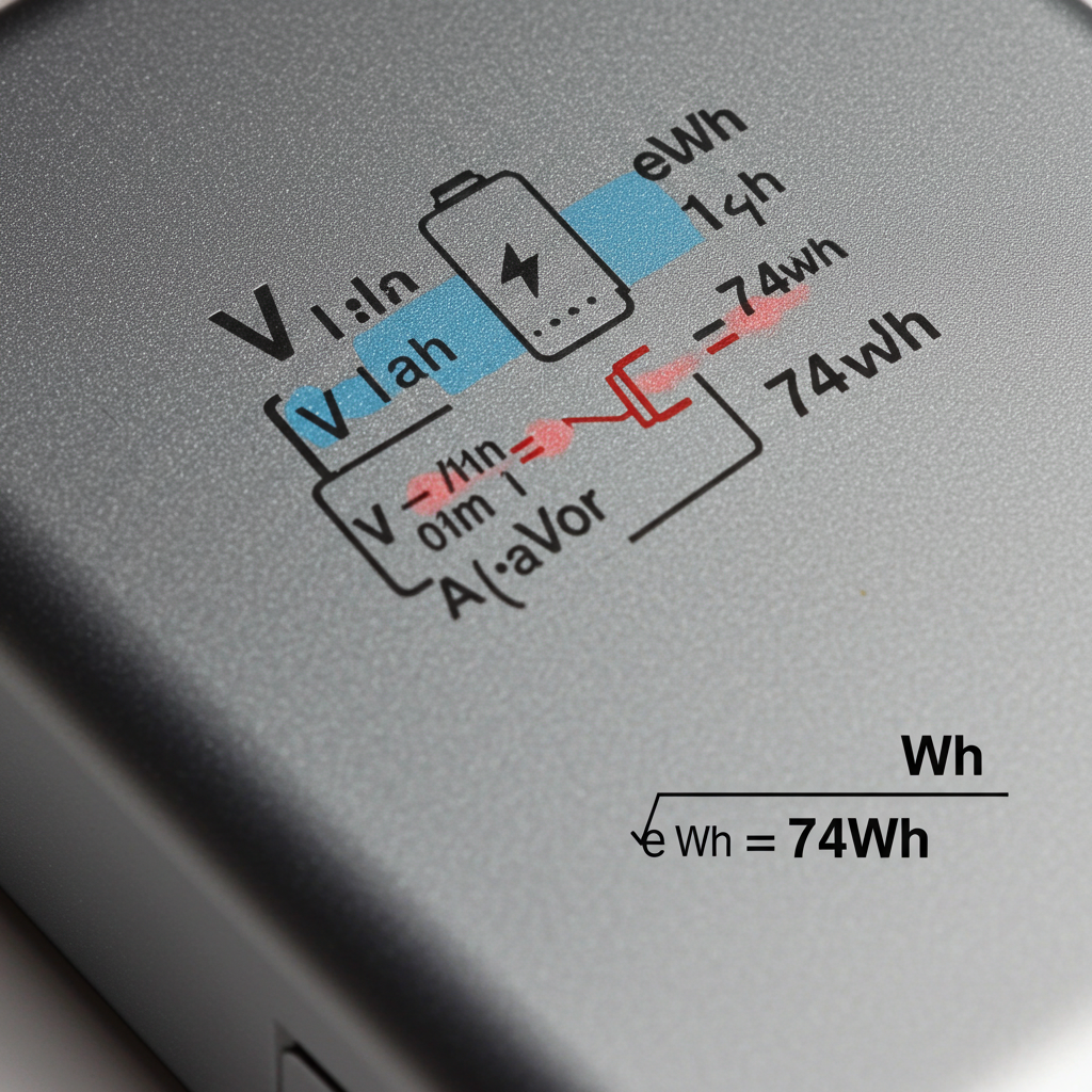 따라서 이 보조배터리의 용량은 74Wh이며, 일반적인 항공 규정(100Wh 이하)을 충족합니다. 배터리 표면에 용량 정보가 명확히 표시되어 있지 않거나 지워진 경우, 항공 운송이 거부될 수 있으니 주의해야 합니다. 대부분의 배터리에는 V와 mAh 또는 Wh 값이 명시되어 있으니 여행 전 꼼꼼히 확인하세요.